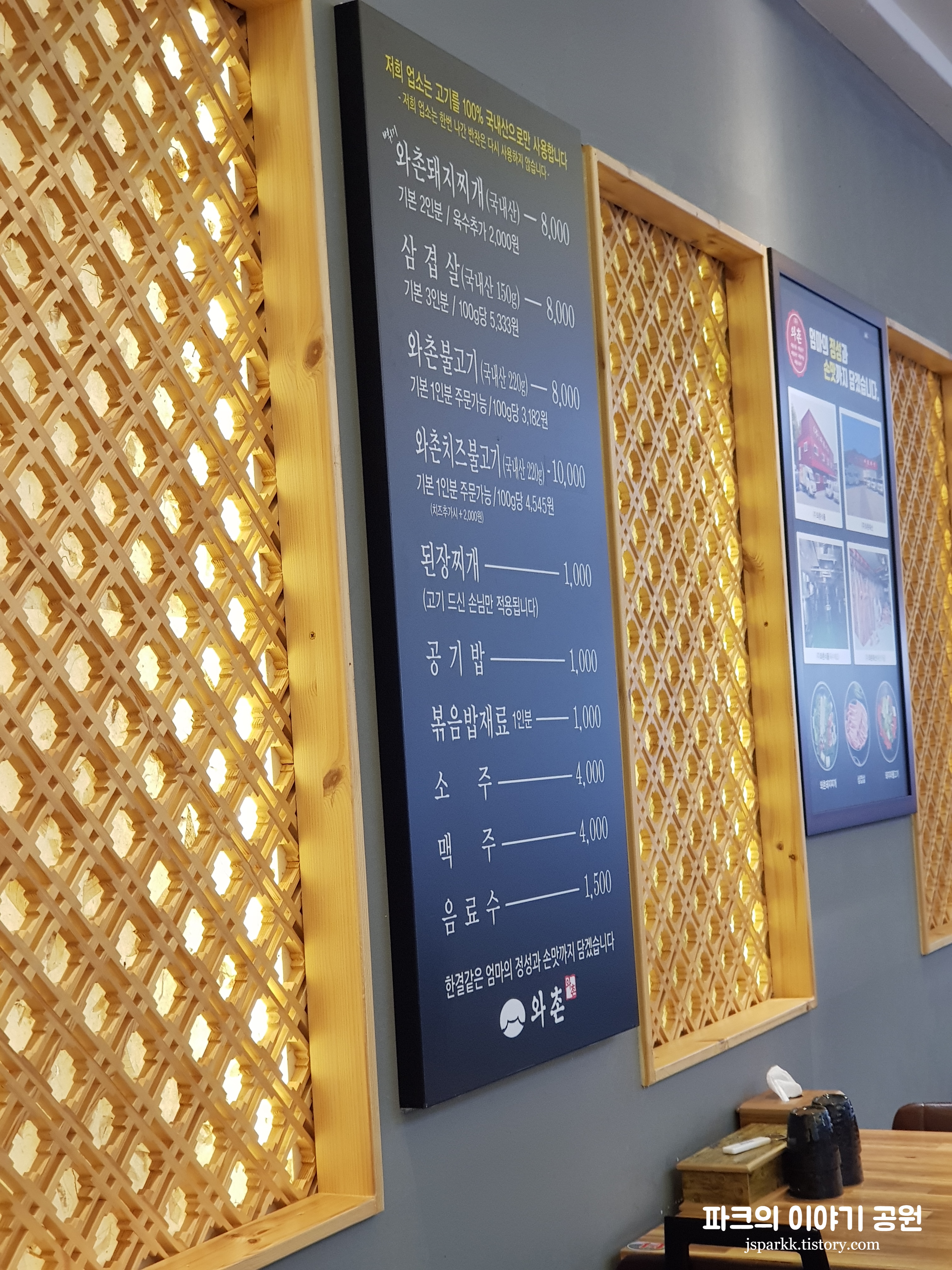 메인 메뉴인 와촌돼지찌개의 경우 1인분에 8,000원으로 매우 저렴하다.