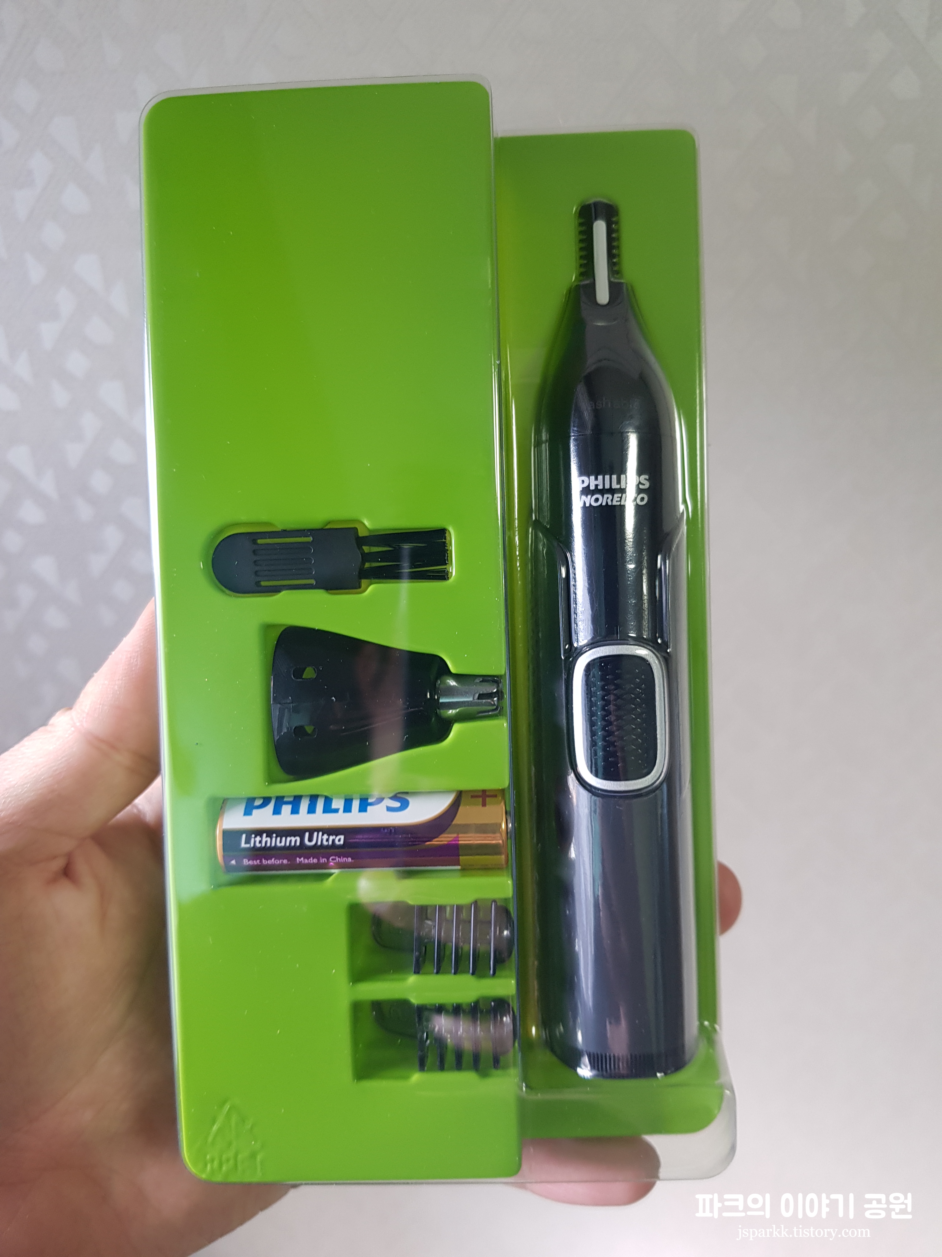 제품 구성은 왼쪽 사진처럼 되어 있다. 눈썹용과 코털용 2가지 헤드가 있으며 눈썹 정리 시 끼우는 것도 있다(명칭은 모르겠다). 그러나 필자는 주로 코털을 제거하는 데 사용하기 때문에 눈썹 정리 기능은 거의 사용하지 않게 된다. 중간 사진에 나오는 코털 제거하는 헤드만 계속 사용하게 된다.