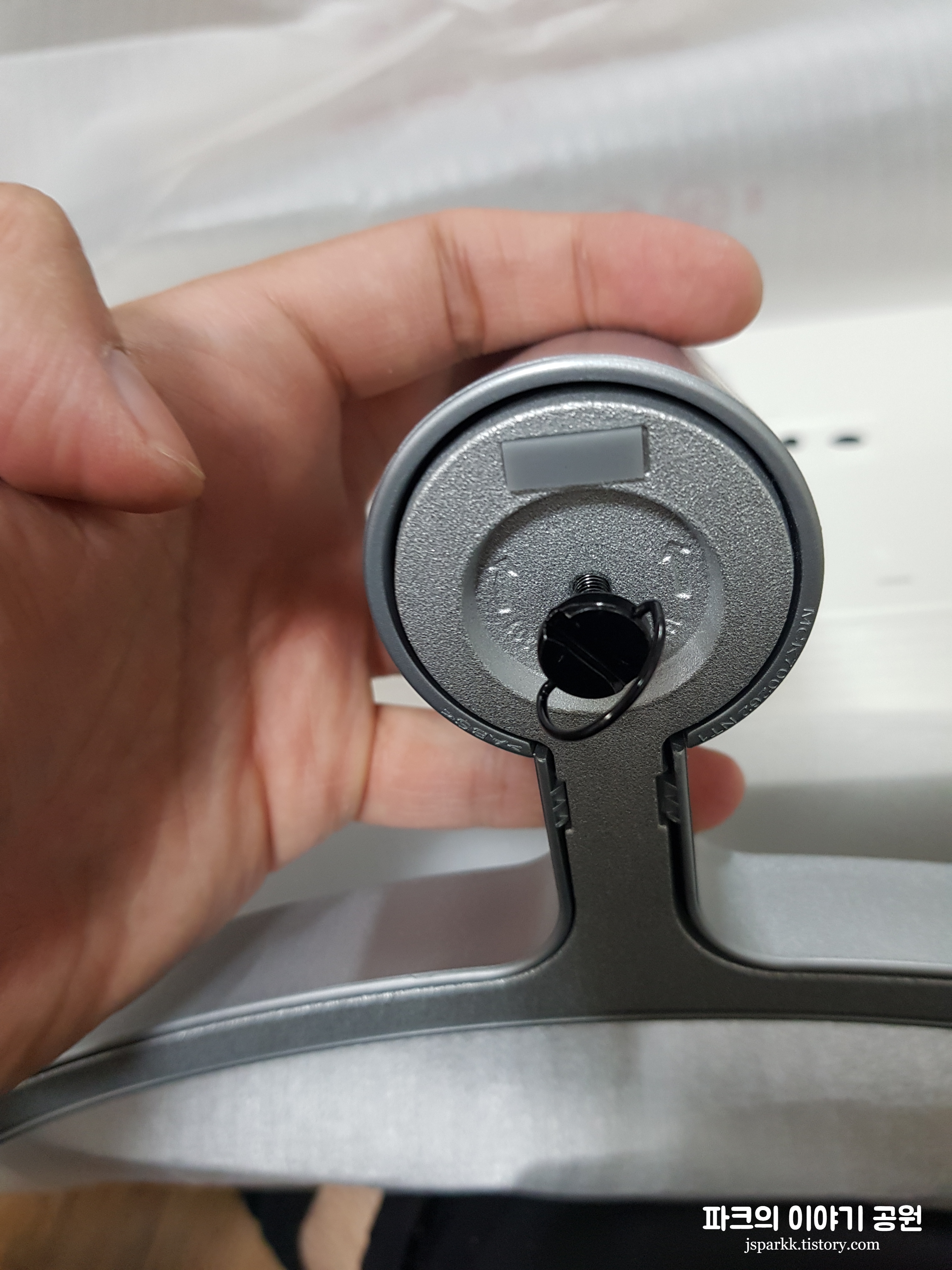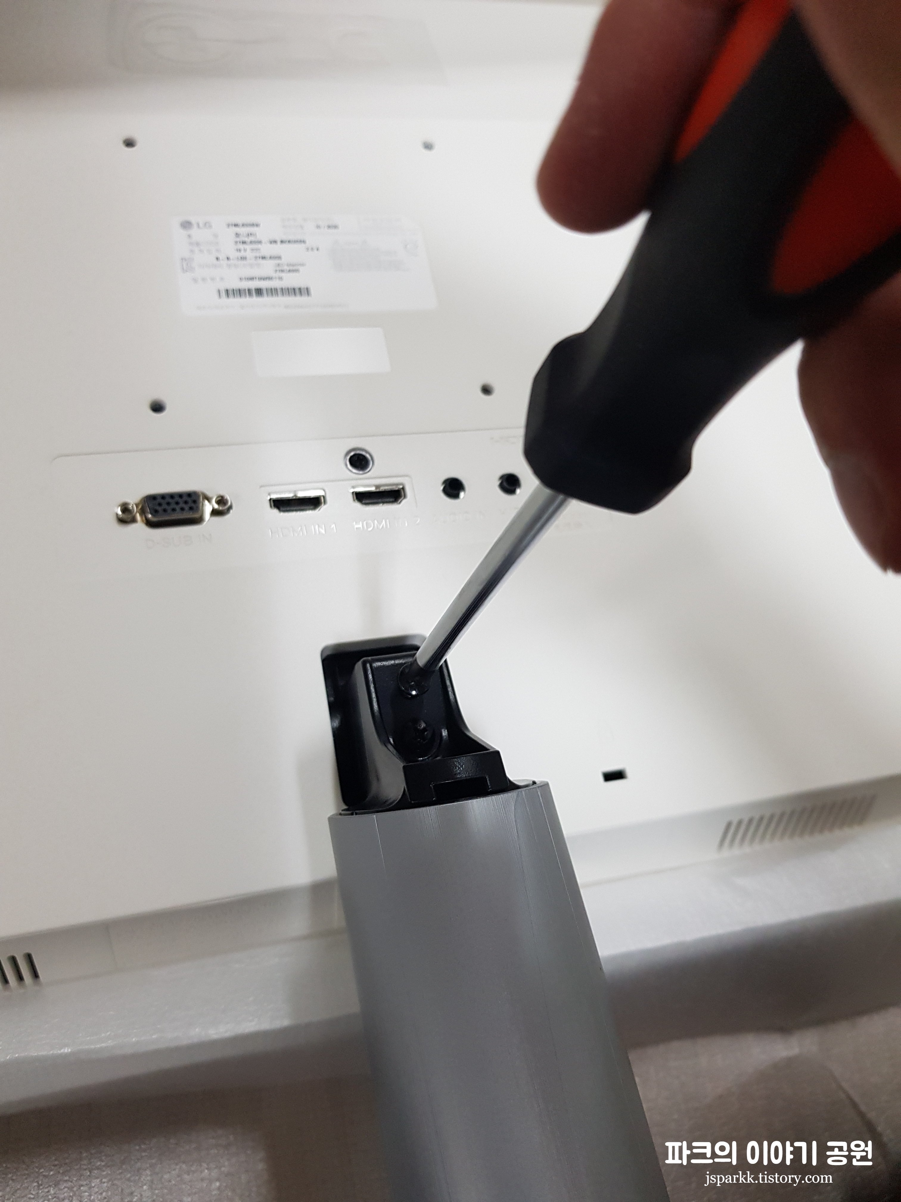 왼쪽 사진처럼 받침대와 모니터를 연결해주는 목? 같은 부분을 나사로 연결해준 뒤(손으로 가능), 받침대를 모니터에 연결해서 나사를 끼우면 된다. 두 번째 과정에서는 십자드라이버가 필요하다.