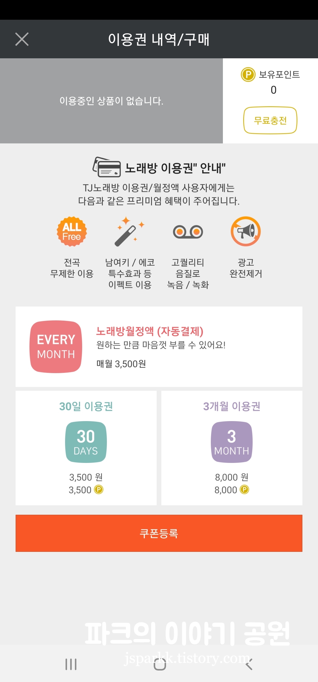 본격적으로 TJ 블루투스 마이크를 사용하여 노래를 부르기 위해서는 우선 블루투스를 활성화하여 마이크와 연결을 해준다. 그 뒤 구글 플레이스토어나 앱스토어에서 TJ 앱노래방 애플리케이션을 설치한다. 그런 다음 TJ 앱노래방에 들어간다. 역시나 무료가 아니다. 월 사용료가 3,500원이다.