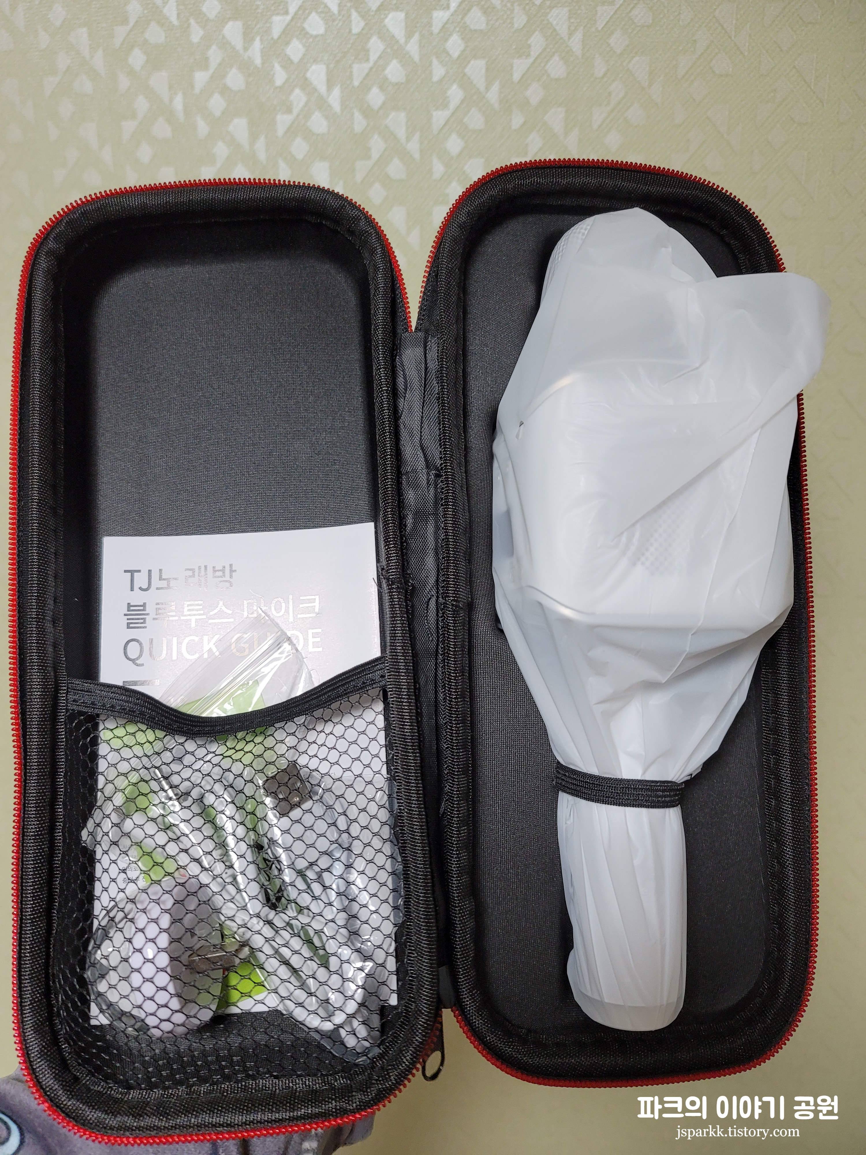 TJ 블루투스 마이크 TMB-10은 제품 구성에 하드 케이스가 기본적으로 포함되어 있다. 그래서 보관이 편리하다. 하드 케이스 안에는 USB 케이블과 노래방에서 돌아가면서 무지개색 불빛을 내주는 미러볼? 효과를 낼 수 있는 미니 미러볼?이 들어 있다.