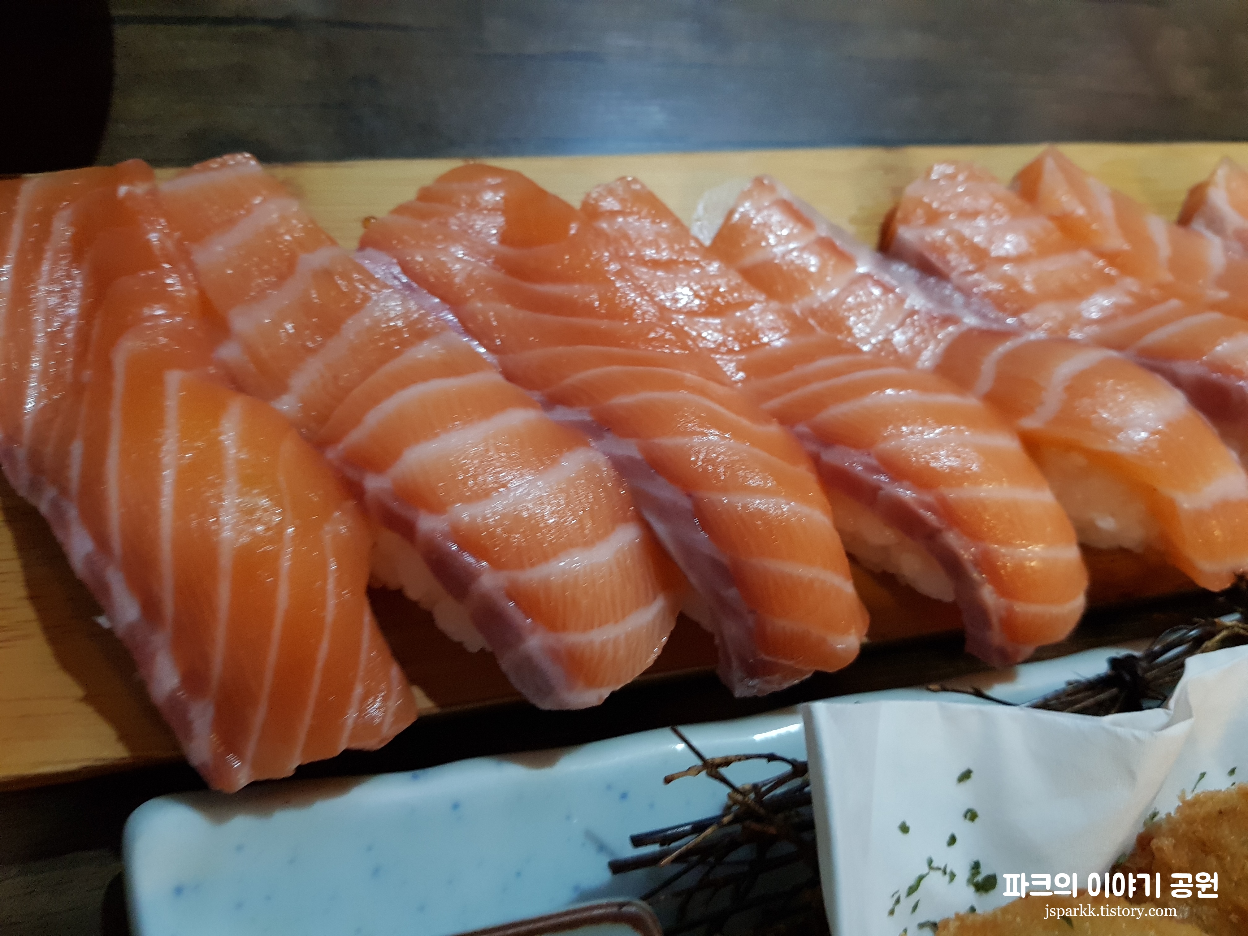 다음은 같이 간 일행이 주문한 연어초밥이다. 사진과 같이 스시호의 연어 초밥은 연어가 매우 두껍고 굵게 나온다. 개인적으로 다녀본 초밥집 중에 가장 연어를 두껍게 썰어주는 집이었다. 연어를 좋아하시는 분이라면 강추하는 메뉴이다.