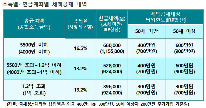 연금저축펀드와 IRP 계좌에 일정 금액을 납입시 연 최대 16.5%의 세액공제를 받을 수 있다. 연금저축펀드의 경우 연 400만 원까지, IRP 계좌의 경우 연 300만 원까지이다. 이렇게 납입한 금액은 만 55세 이후에 수령할 수 있으며, 수령 시 일반 과세 비율보다는 훨씬 낮은 세율인 3.3~5.5%만 적용된다. 즉, 연 700만 원까지 약 10% 이상의 수익이 보장되는 투자 방법이라는 것이다.