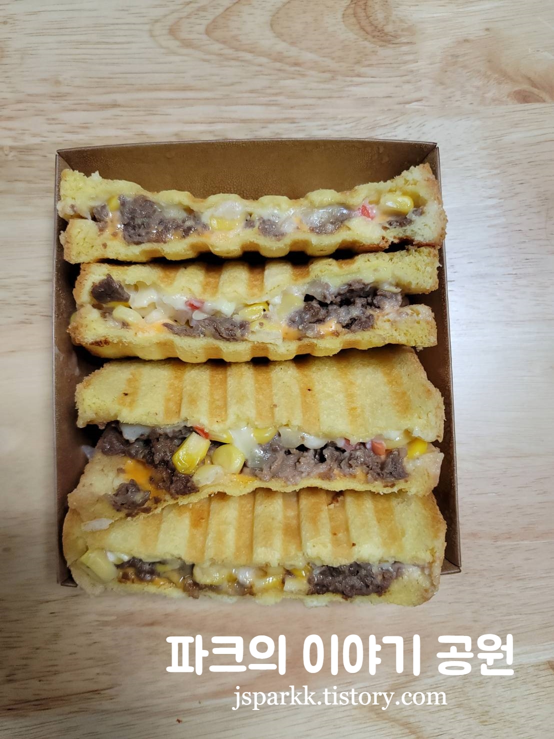 다음으로 불고기토스트이다. 불고기토스트 역시 안에 불고기토핑, 치즈, 옥수수, 야채가 들어 있다. 불고기토스트도 안에 치즈가 많이 들어 있어서 피자를 먹는 느낌이 들었다. 이것 역시 생각보다 양이 많아서 점심 대용으로 먹으면 좋을 것 같다는 생각이 든다.