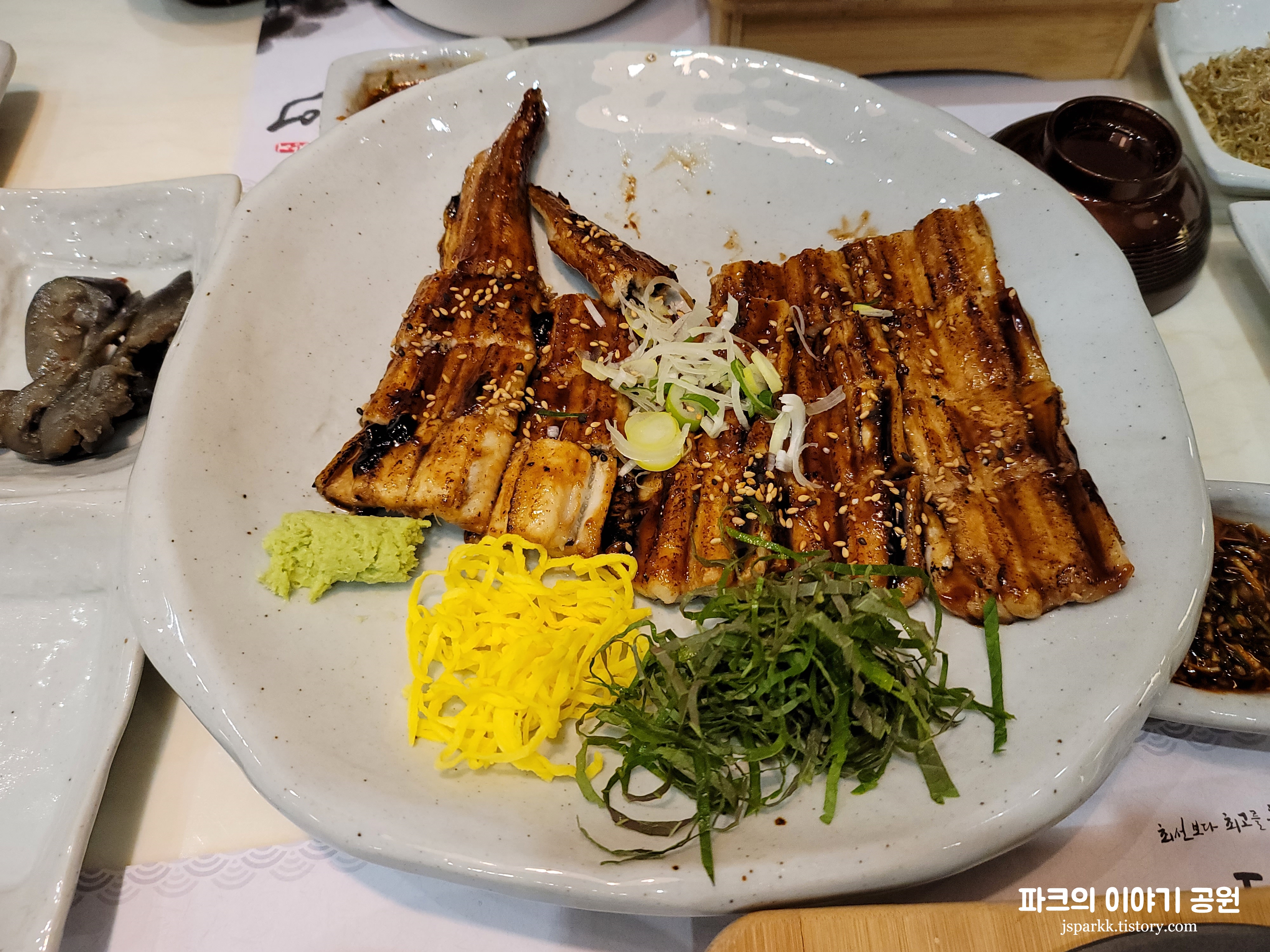 마지막으로 메인 메뉴인 바다 장어 구이가 나왔다. 양념이 엄청 짜거나 달지 않고 적절한 수준이었다. 굽기도 매우 적절하게 구워져서 깔끔하게 나온다. 장어를 와사비와 같이 먹은 적은 처음인데 조화가 괜찮았다. 엄청 맛있거나 엄청 별로거나 하지 않고 딱 적당한 수준이었다. 매우 깔끔했다.