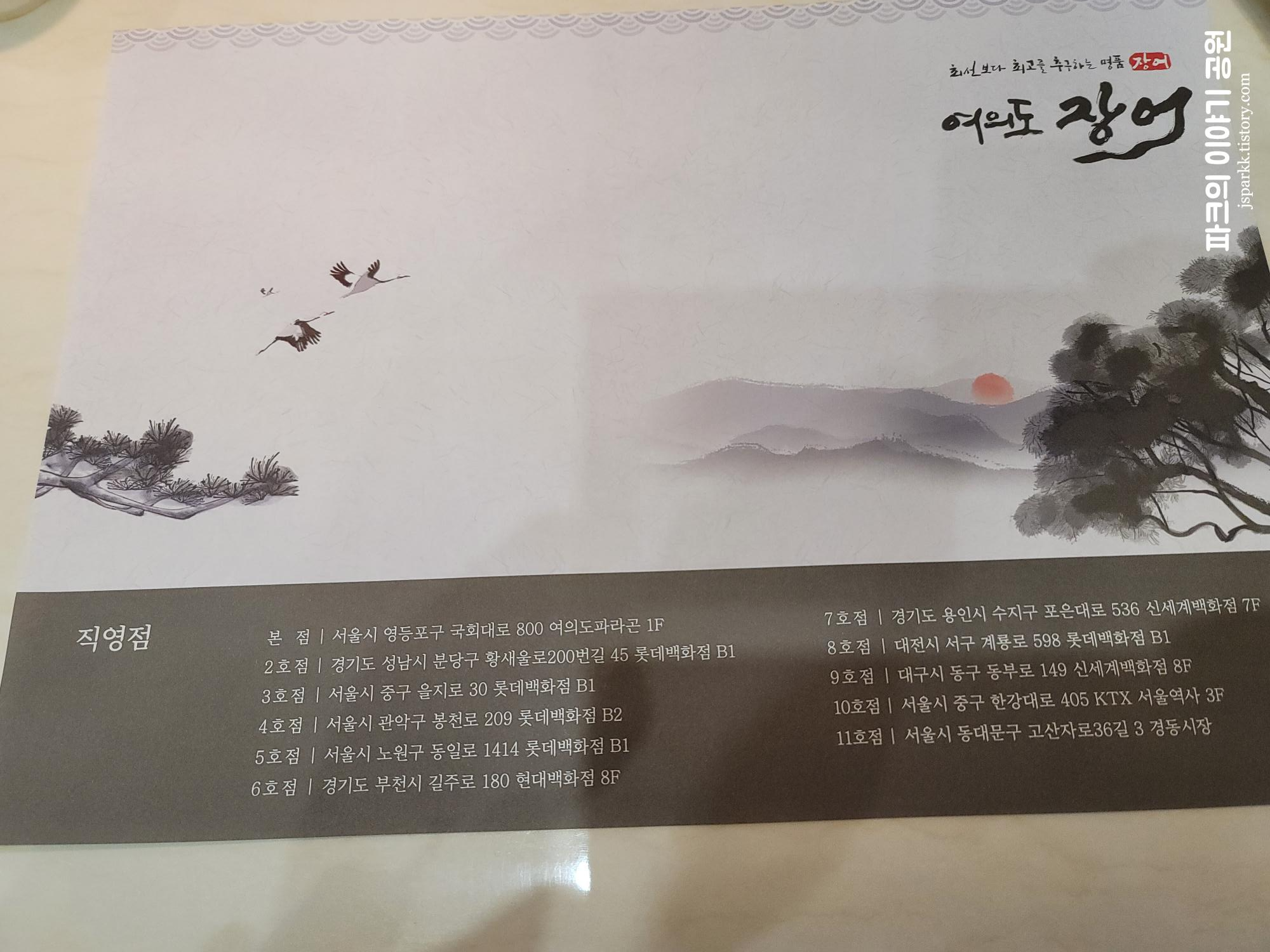 여의도 장어는 총 11호점으로 이루어져 있다. 주로 백화점에 전문으로 입점해 있는 프랜차이즈로 보인다. 다수의 백화점에 입점해 있을 정도면 어느 정도 퀄리티가 보장되었다고 볼 수 있다.
