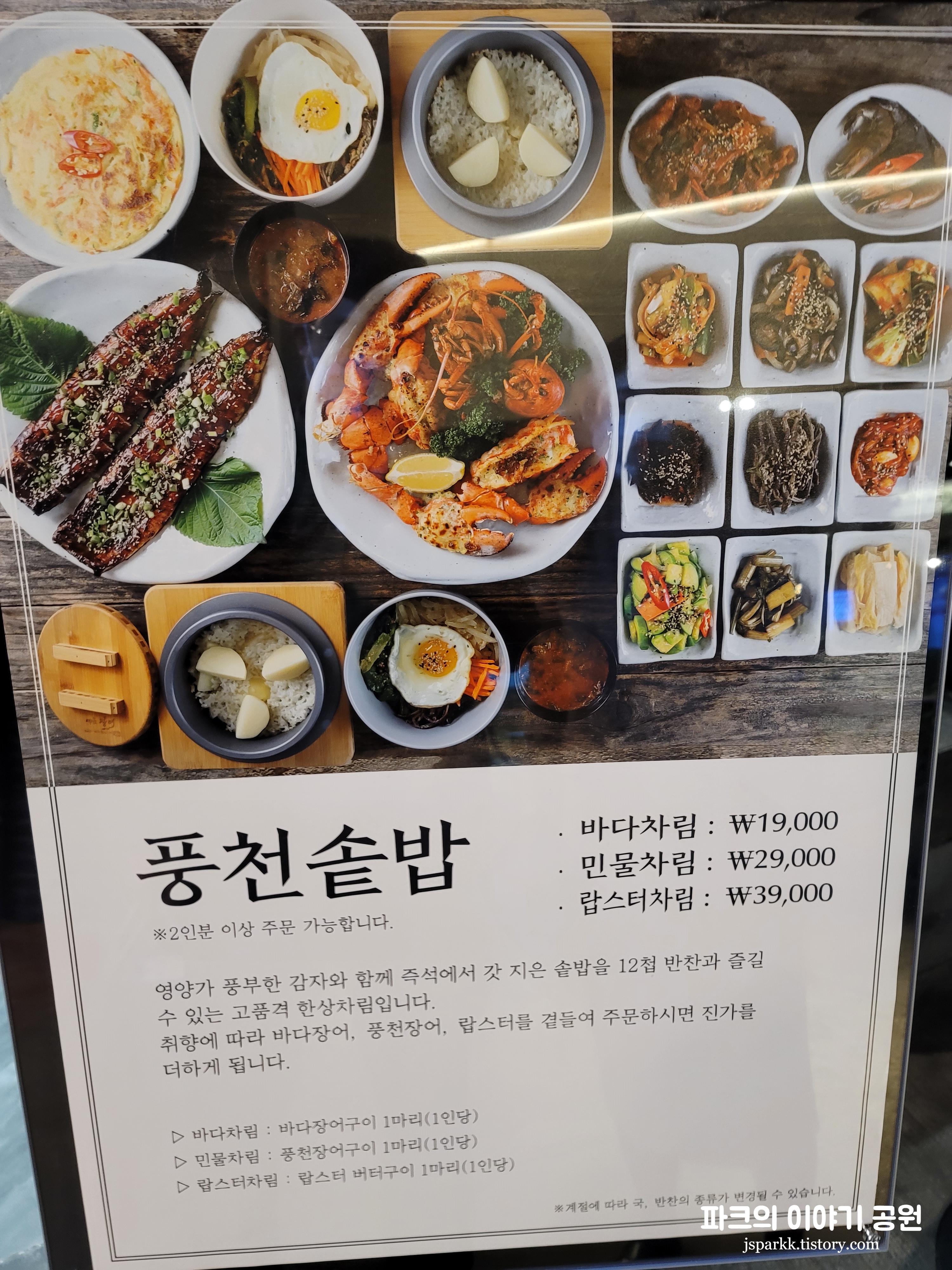 여의도장어의 메뉴판이다. 우선 풍천솥밥이라는 세트 구성이 있다. 12첩 반찬에 가격대별로 바다장어, 풍천장어, 랍스터가 메인 메뉴로 나온다. 세트 외에도 랍스타 버터구이, 풍천장어 스테이크정식 등 단품 메뉴들도 있다. 필자는 풍천솥밥 바다차림(19,000원)을 주문했다.