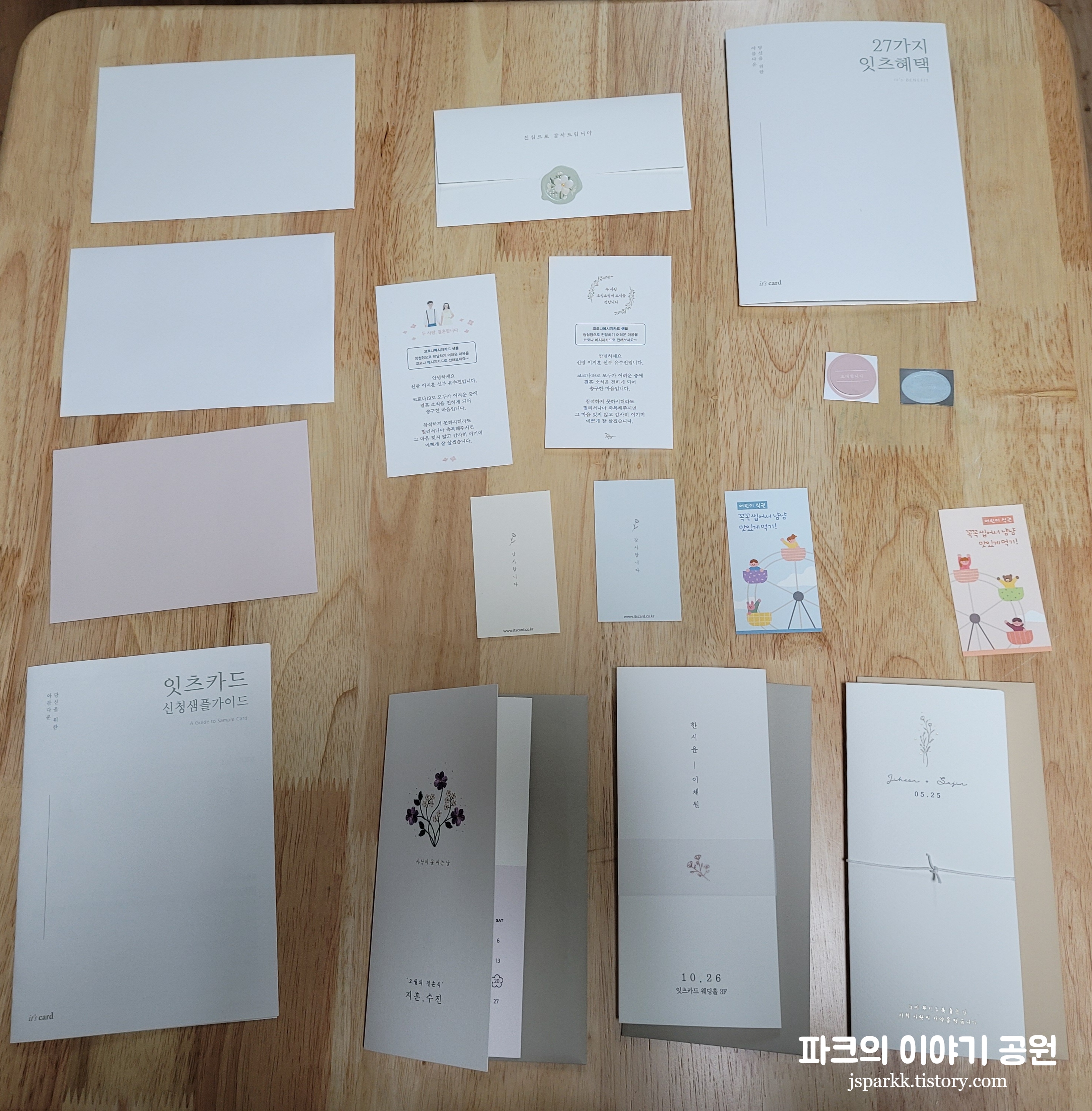 샘플 구성은 내가 고른 청첩장의 샘플, 청첩장 가격표와 제작 과정이 담긴 가이드, 잇츠카드에서 제공하는 27가지 혜택을 모두 정리한 팜플렛, 청첩장 봉투, 식권, 감사장, 스티커 등으로 구성되어 있다.