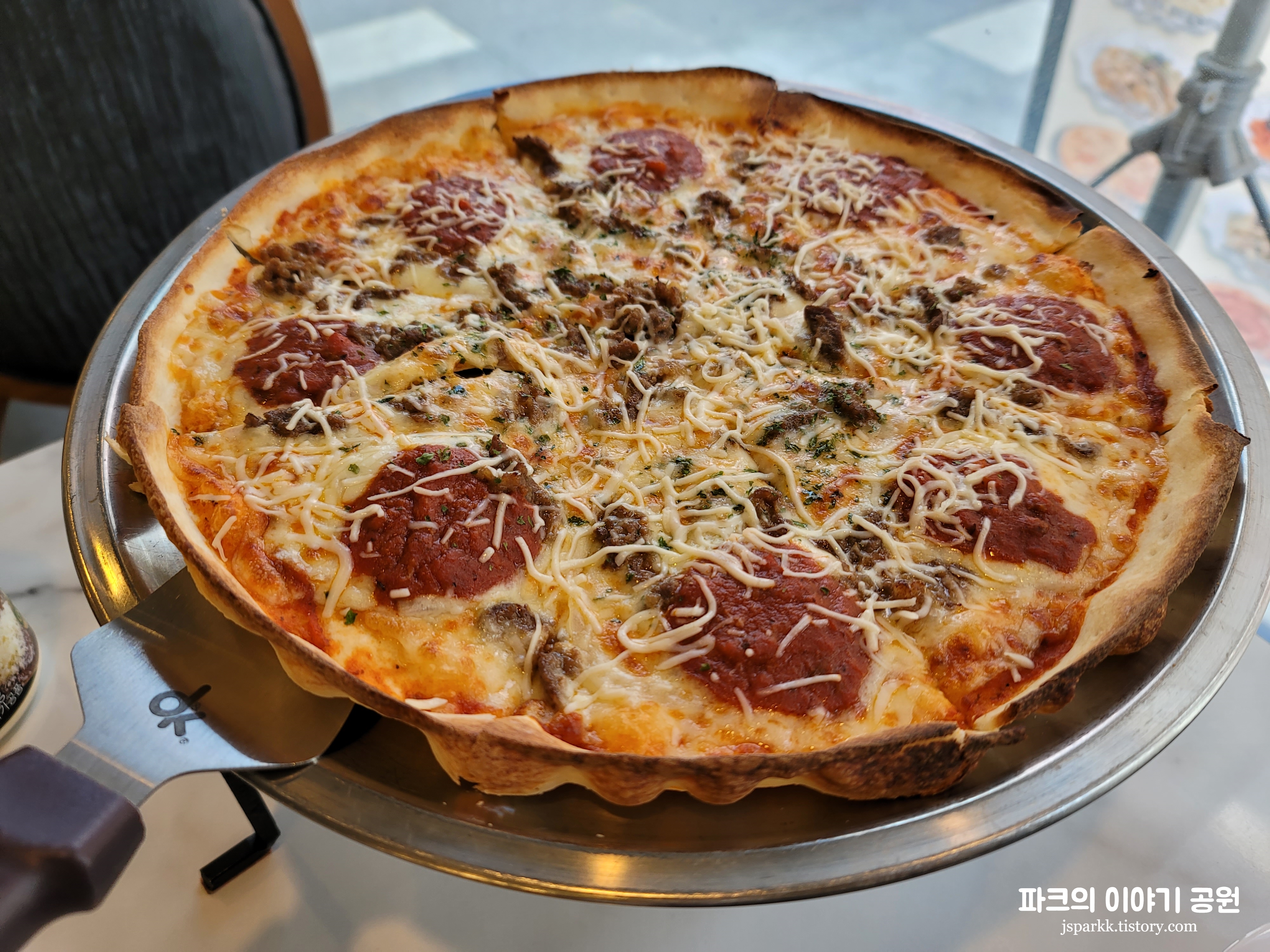 다음으로 두 번째 메뉴인 '불고기 볼로네제 라구 피자'가 나왔다. 팬피자에 불고기와 볼로네제 소스가 함께 들어 있는 피자이다. 볼로네제 소스와 치즈, 불고기가 궁합이 좋았다. 볼로네제 소스가 피자의 느끼함을 잡아주고 불고기가 피자의 풍미를 더해주었다.