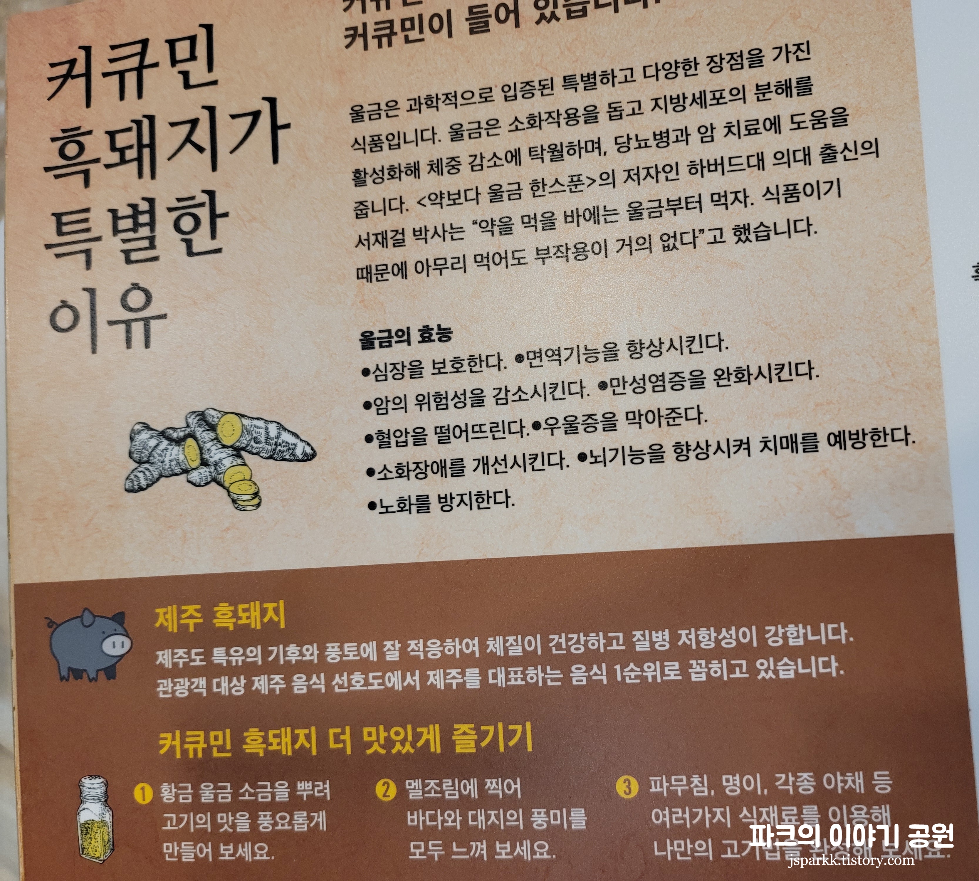 커큐민 흑돼지는 이름 그대로 울금 소금을 뿌려 고기의 맛을 더 풍요롭게 만든 흑돼지이다.
