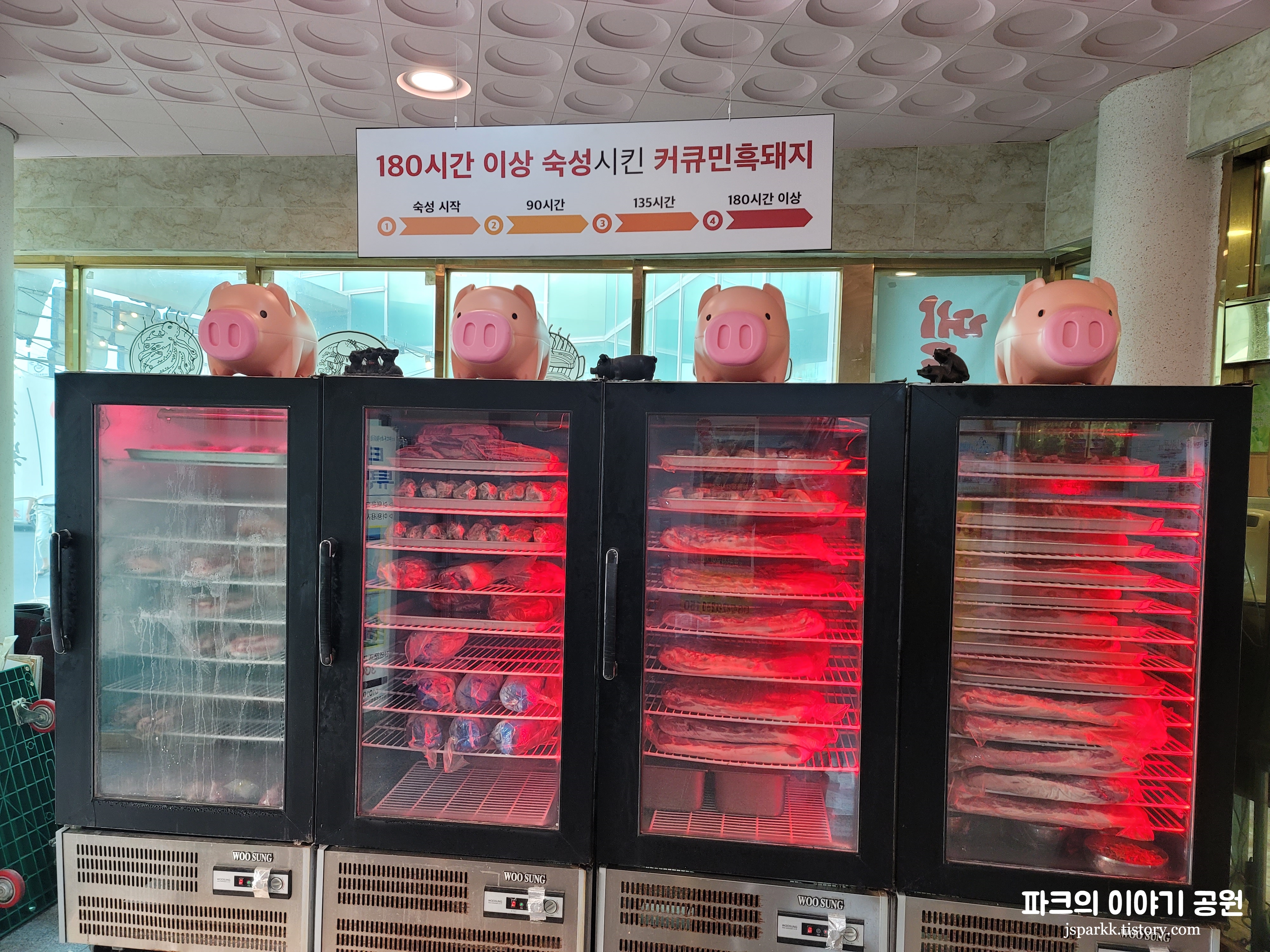 식당 입구에 이렇게 흑돼지를 180시간 숙성하는 과정을 전시(?)해놓았다. 이렇게 다 보이는 곳에 설치 해놓은 것은 그만큼 퀄리티에 자신이 있어서 일 것이라 생각한다.