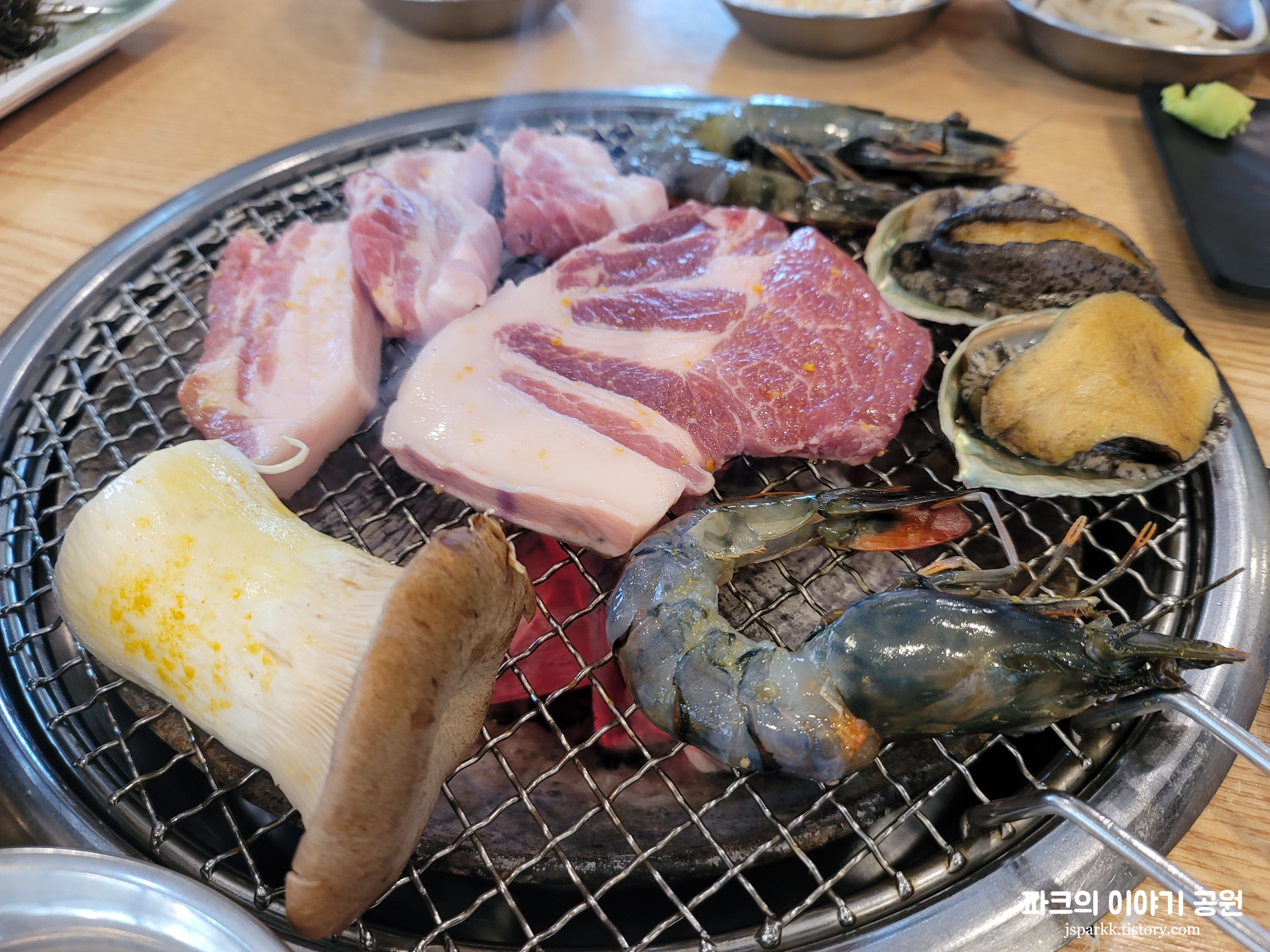 일단 모듬세트를 주문했다. 오겹살, 목살, 가브리살, 항정살, 양념갈비, 전복, 새우가 들어 있다. 2~3인분용 75,000원, 3~4인분용 95,000원이다. 싸진 않다.