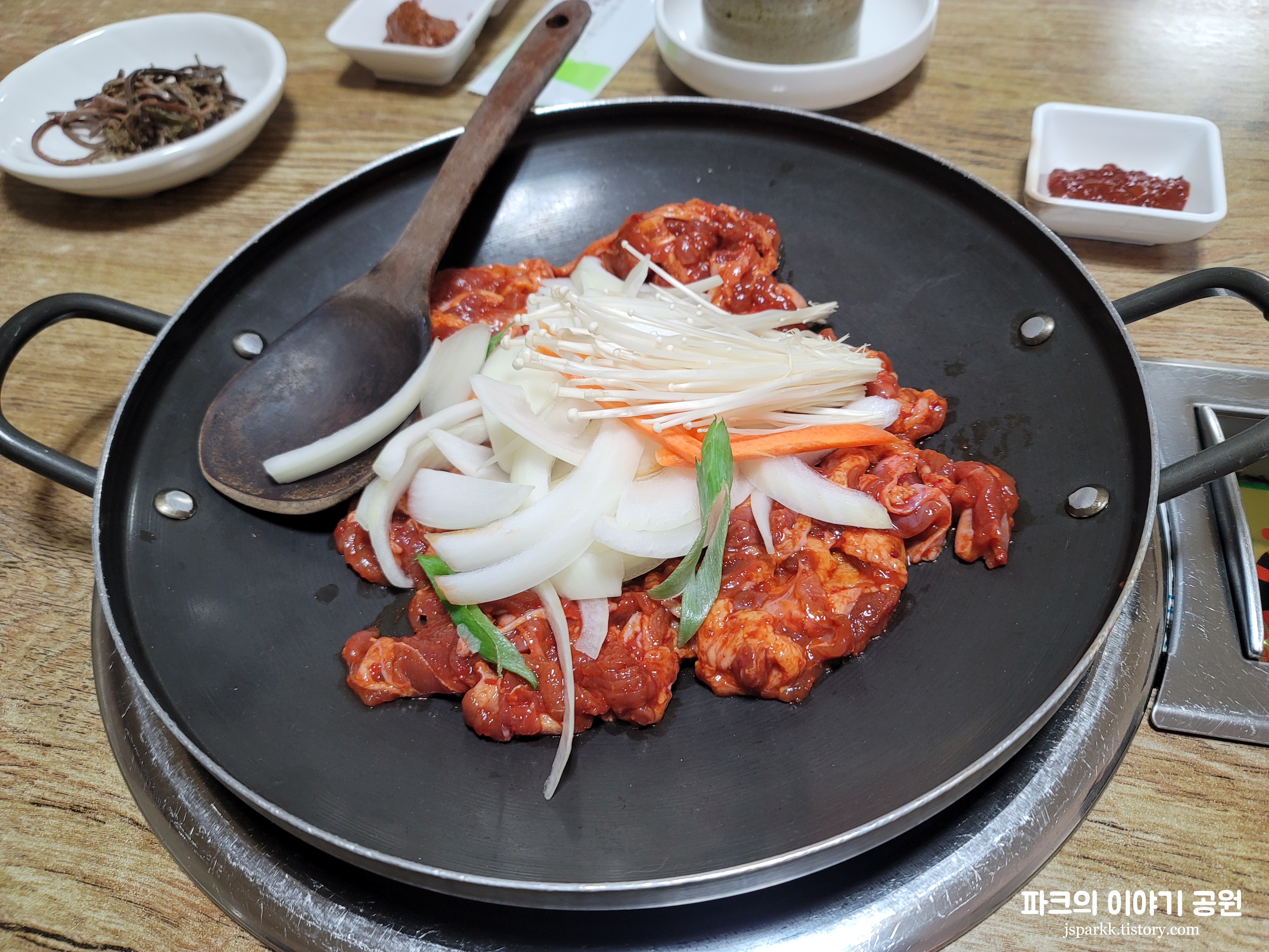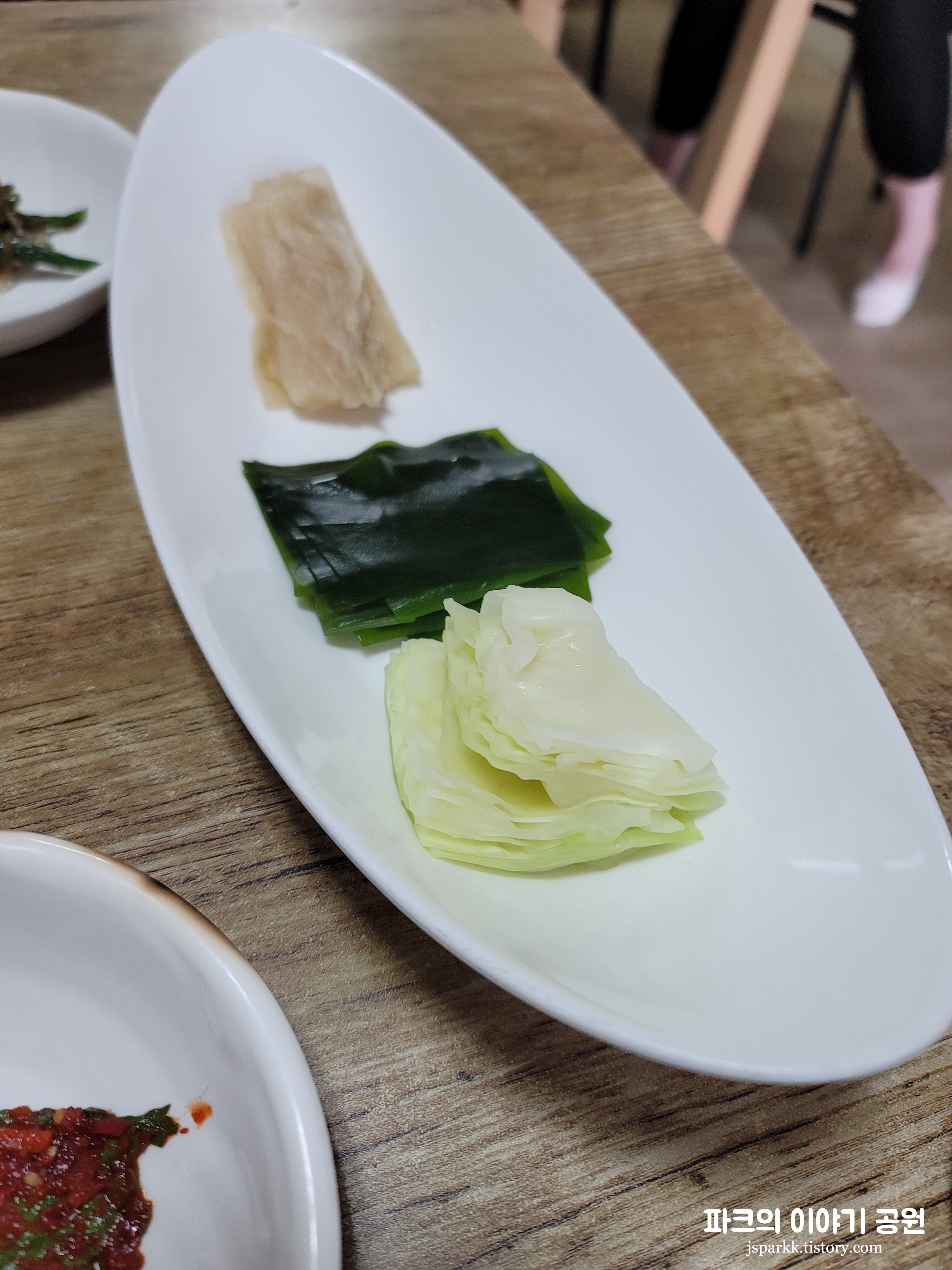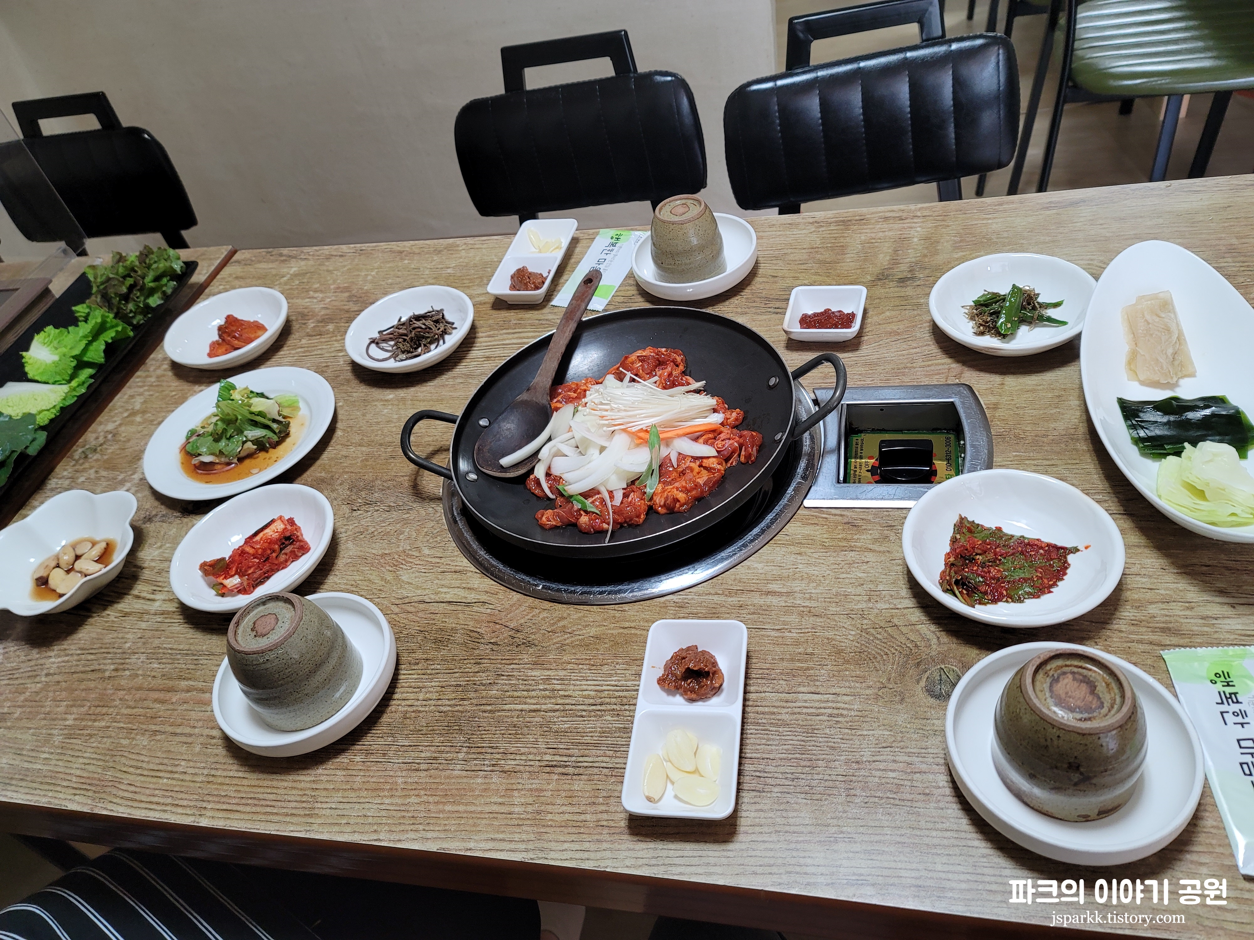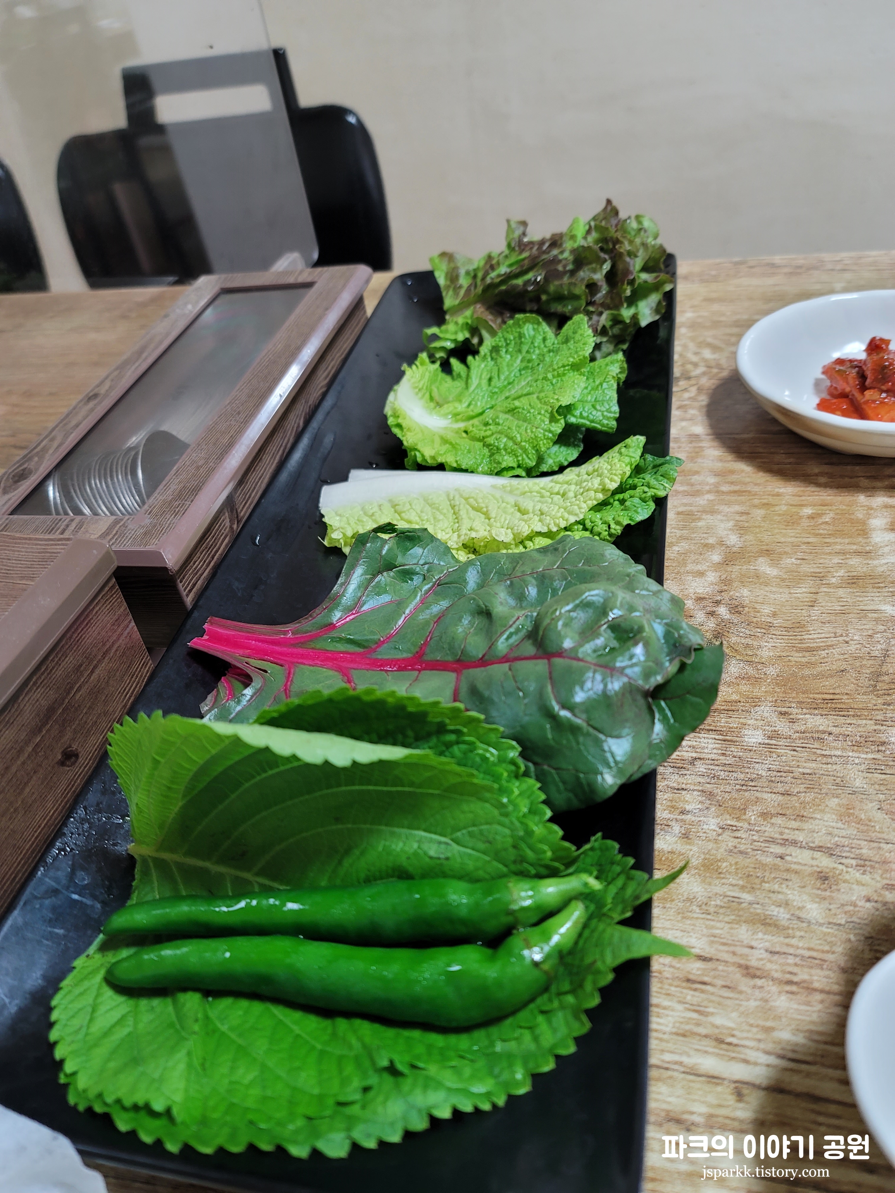 미리 예약을 하고 간 터라 세팅이 되어 있었다. 위 사진처럼 전체적으로 다양한 쌈이 있어서 좋았다. 그리고 반찬들도 깔끔했다. 오리주물럭의 경우 솔직히 그렇게 맛있는 편은 아니었지만, 먹을만했다. 양도 많지는 않고 적당한 수준. 막 엄청 맛있다 느낌은 아니었다. 깔끔하다는 느낌이었다.