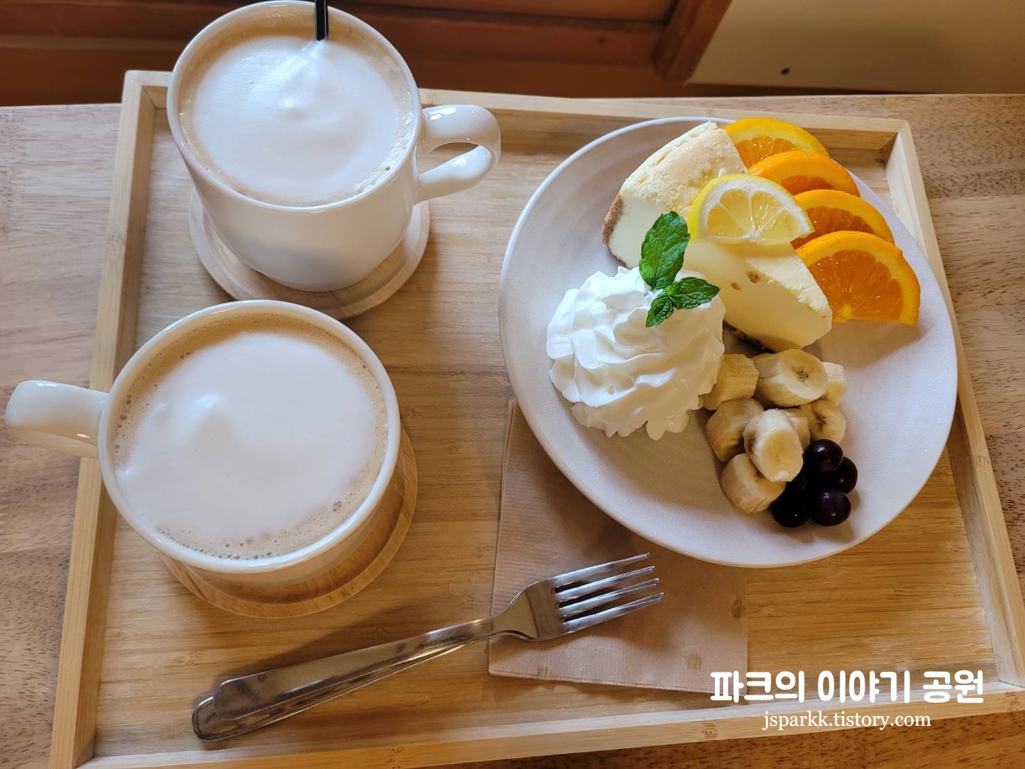 방을 배정받고 기다리다 보면 직원분이 주문한 메뉴를 배달해주신다. 우리는 카페라떼와 크림치즈케이크 메뉴를 주문했다. 이 집은 두유라떼가 유명하다고 하는데, 너무 달+달 조합인 것 같아 하나는 쓴 카페라떼로 밸런스를 맞추었다.