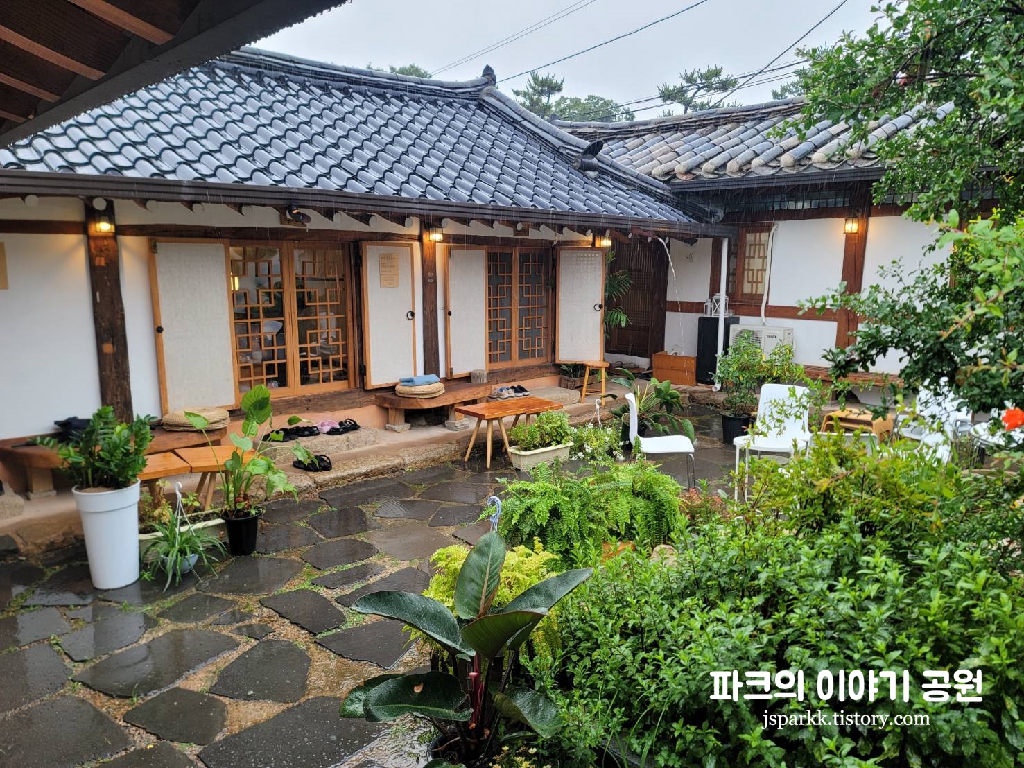 방 내부에서 본 카페 풍경이다. 빗소리를 들으며 한옥의 풍경을 감상하는 것은 최고의 힐링이었다. 비오는 날 오는 게 더 좋은 카페인 것 같다.