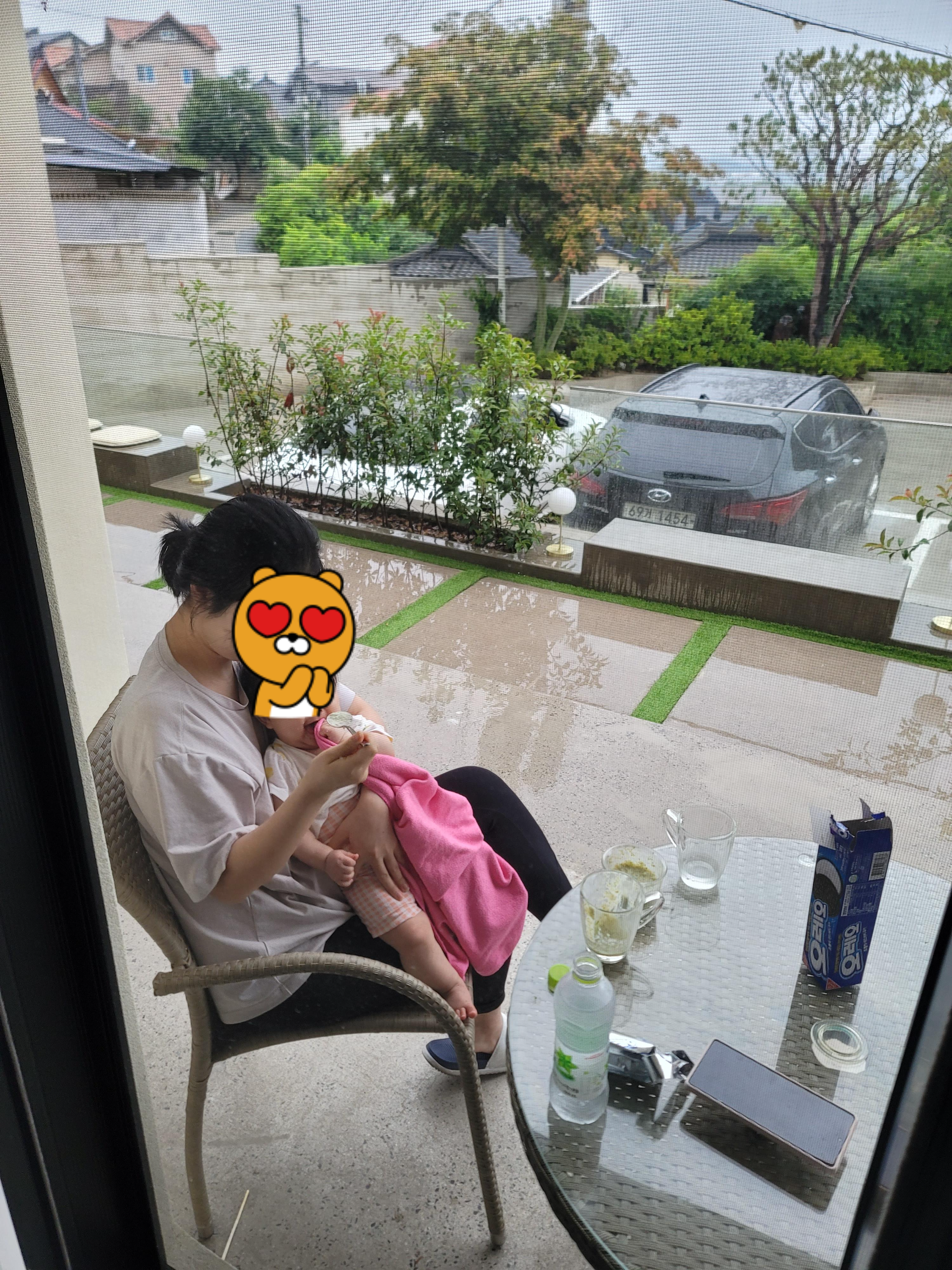 비와 빗소리를 들으며 아기 이유식을 먹였다ㅋㅋ