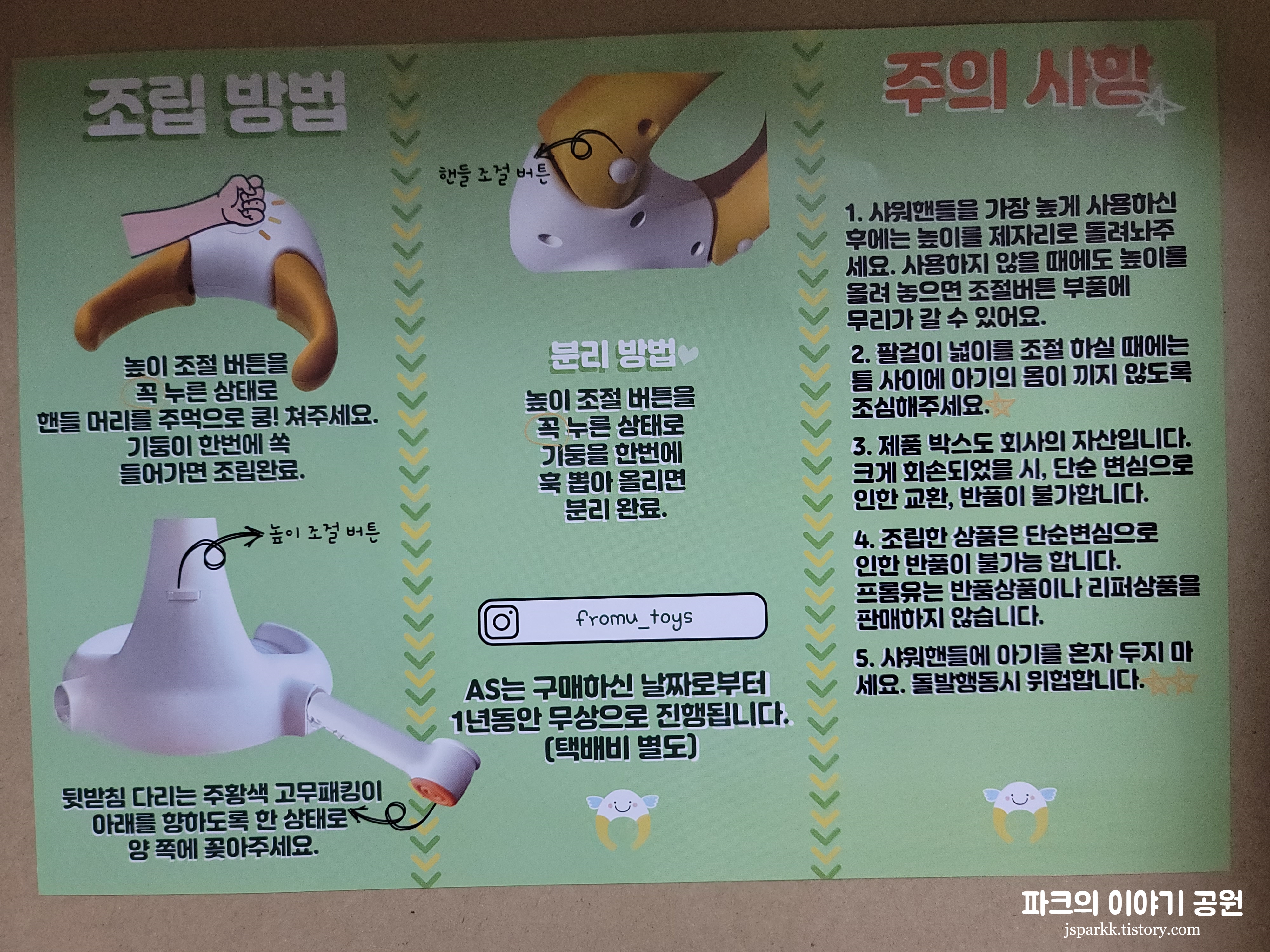 조심스러운 마음으로 귀여운 우리 아기를 프롬유 샤워핸들에 태워보았다. 손잡이가 꽉 쪼여서 힘들지는 않을까, 서있는걸 힘들어하지는 않을까 걱정이 되었다.