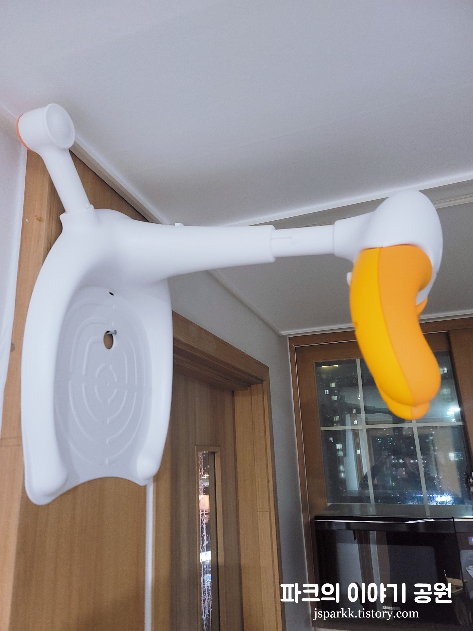 평소 상대적으로 잘 다니지 않는 다용도실 부근에 시계를 달 만한 높이에 못을 박았다. 그리고 거기에 프롬유 샤워핸들 중간에 있는 뚫려있는 부분을 이용해 걸어 놓는다. 이렇게 하면 두 가지 장점이 있다. 첫 번째 장점은 위쪽에 보관을 함으로써 프롬유 샤워핸들 보관으로 있는 자리를 차지하는 것에서부터 해방될 수 있다는 것이다. 두 번째 장점은 곰팡이가 생기는 것을 방지할 수 있다는 것이다. 프롬유 샤워핸들은 항상 물에 젖을 수밖에 없는 제품이기 때문이다. 이런 상태에서 땅에 놓아서 보관을 하면 곰팡이가 생기기 쉬울 것이다. 하지만 위쪽에 보관을 함으로써 제품에 물이 고이는 것을 막아주어 곰팡이의 위험으로부터 해방될 수 있다. 다만 이렇게 하면 물이 땅바닥에 계속 떨어진다. 그래서 필자는 바로 아래에 빨래 바구니를 배치하여 물에 젖는 것을 방지하고 있다.