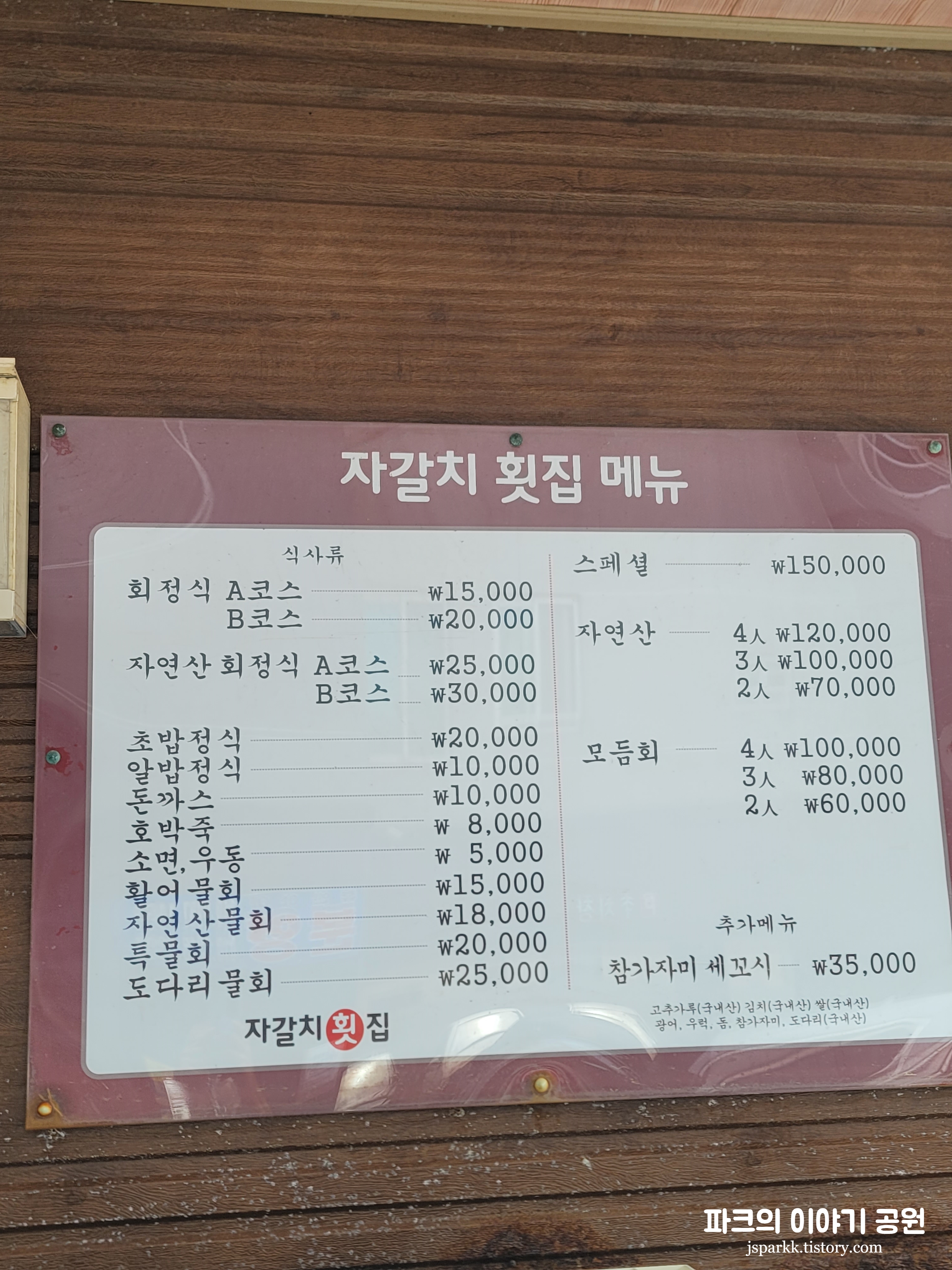 자갈치 횟집의 메뉴판이다. 이 식당에서 제일 유명한 것은 회정식 코스이다. 생일인데 기분으로 자연산 회정식을 먹어야 되나, 아니면 그냥 회정식 코스를 먹어야되나 고민을 많이 했다. 그래서 일단 직원분한테 물어보았다. 그런데 직원분이 최근 포항에 태풍 힌남노가 와서 자연산 회가 잡히지 않아 일반 회정식만 가능하다고 하셨다. 덕분에 고민을 명쾌히 해결하고 우리는 회정식 B코스를 2개 주문했다. 그리고 여기가 물회 맛집이라는 말도 있어서 배가 부를 것 같았긴 하지만, 생일이라는 명분으로 물회까지 하나 주문했다.