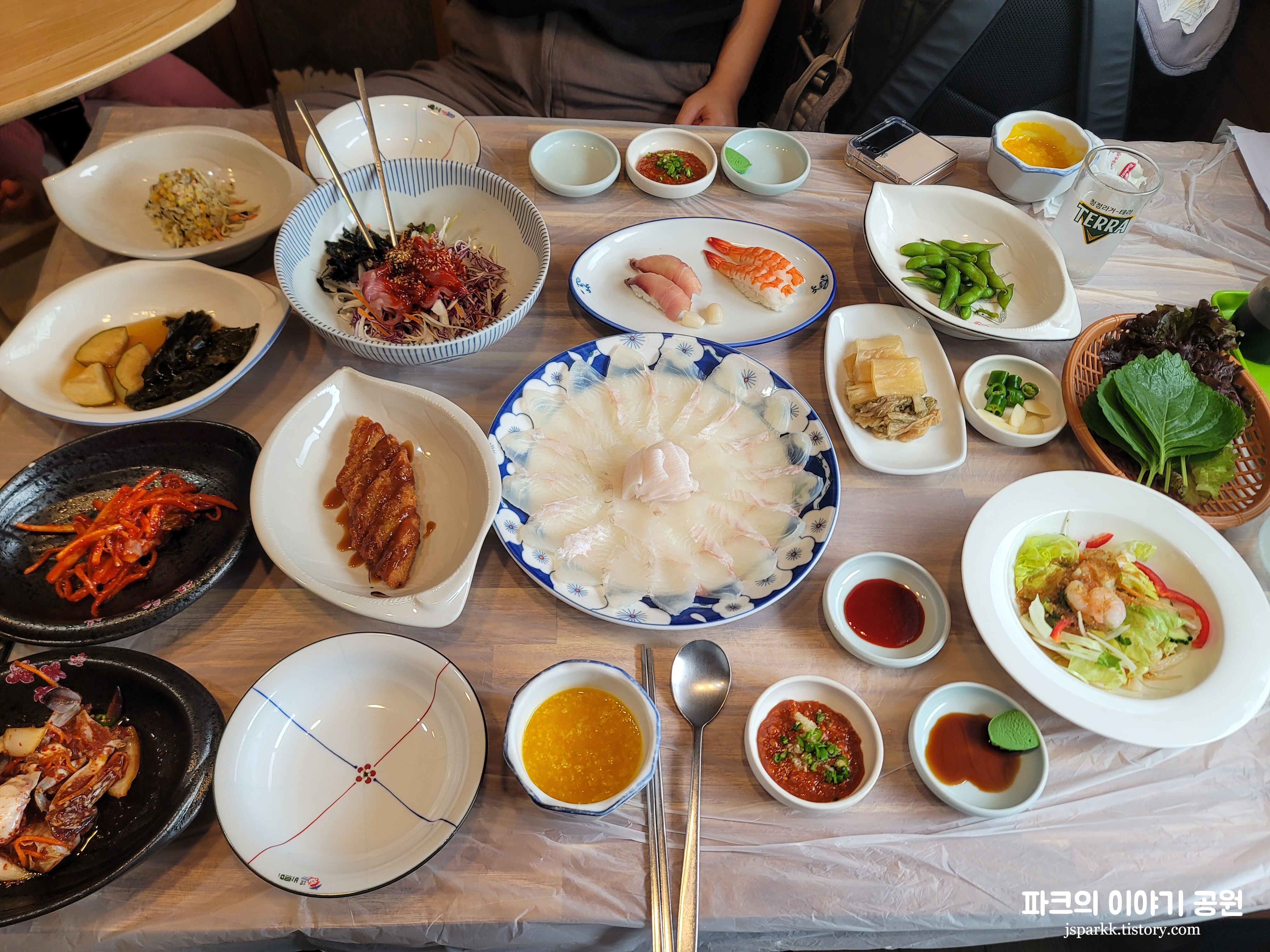 미리 예약을 해놓아 방이 준비되어 있었다. 우리는 블로그 리뷰를 보고 '단독룸'인줄 알고 이 횟집을 선택했었다. 하지만.. 막상 가보니 반전이 있었다...