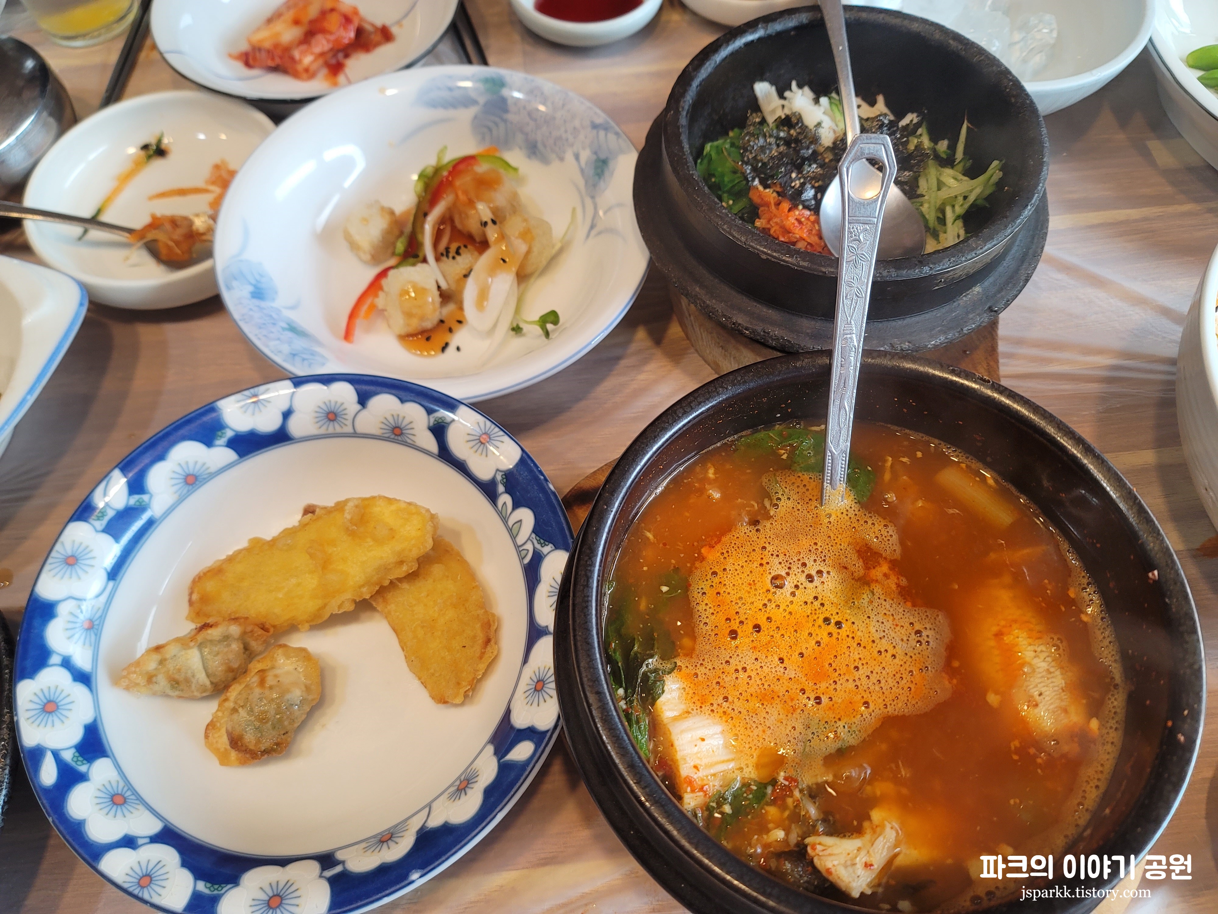 회정식을 어느정도 먹고 나면 튀김류와 두부 탕수육, 알밥과, 공깃밥 그리고 매운탕을 준다. 이 집은 심지어 매운탕도 정말 맛있었다. 하지만 개인적으로 알밥은 뭔가 별로였다. 알밥 안에 물컹물컹한 뭔가가 섞여 있는데, 개인적으로 좋아하지 않는 식감이어서 별로였다. 그래서 나는 공깃밥에 매운탕을 먹었다. 매운탕이 정말 맛있어서 밥 한 공기를 순식간에 해치웠다.