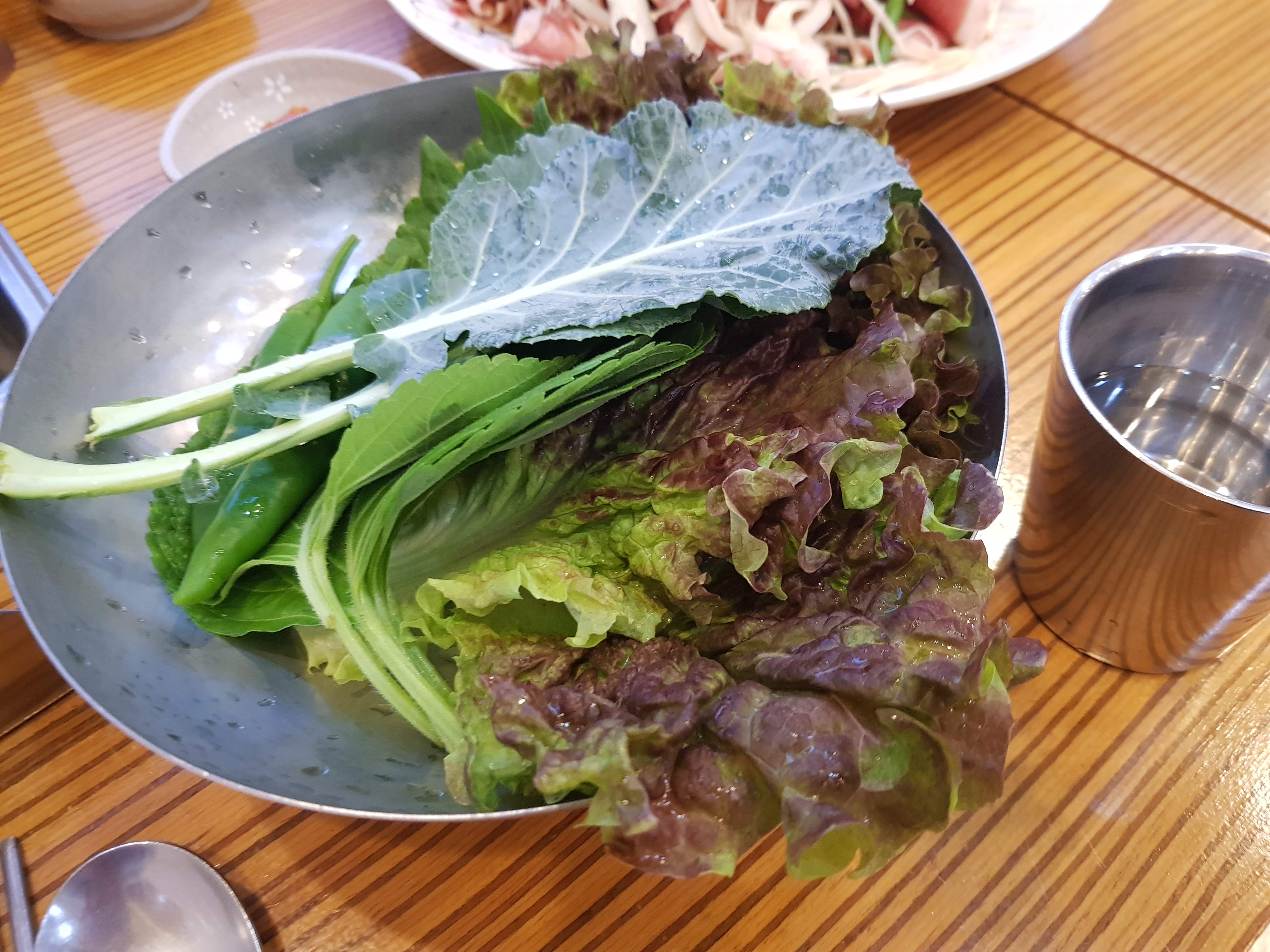 쌈채소와 마늘 그리고 여러가지 밑반찬들이 제공된다.