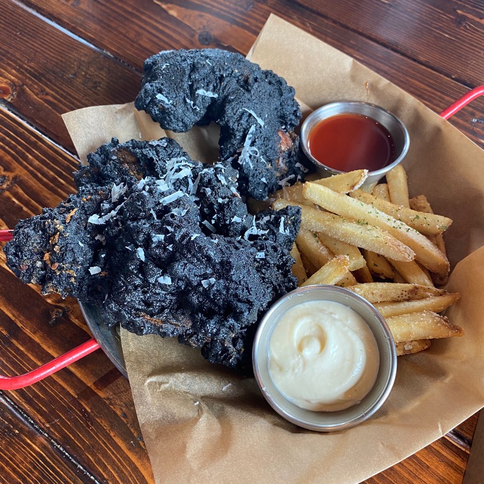 남해 특산물 흑마늘 진액과 오징어 먹물 반죽의 건강한 검정색 치킨이다.