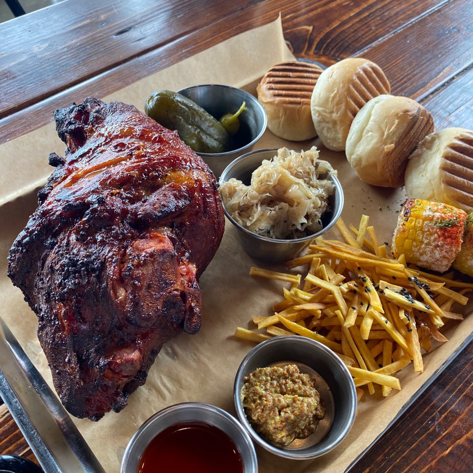 부드럽게 저온조리 후 오븐에서 구운 독일 남부식 돼지 앞다리인
