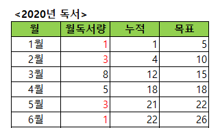 다음은 최근의 사례다. 필자는 2020년에 초에 올해 독서 목표를 세우고 월별로 목표를 분할하여 관리하고 있다.